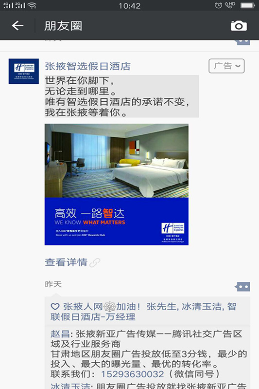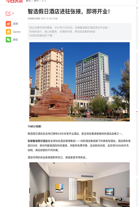 2017年10月10日我公司于洲际酒店旗下张掖智选假日酒店正式达成合作,签订未来一年在张掖高速、张掖西站、院线、新媒体等媒介载体上展开全方位广告投放。